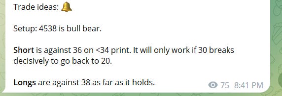 Going into Globex we had 38 as bull bear and short against 36 once <34 printed. This gave great short at 34 that gave 30+ point by morning. After RTH open we shorted 08 to 20+ points. We also took 90 short couple times for few points. We missed flipping long against 92 in afternoon and tried short against 4500 and tried again at 4514 at the end of the day once but got out without getting paid.