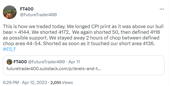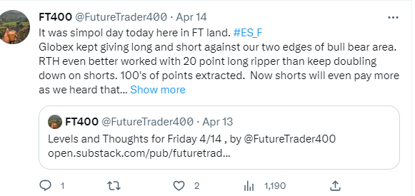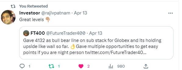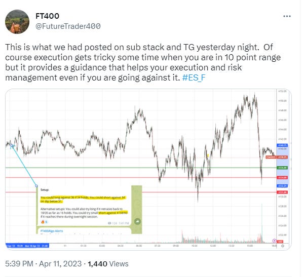 Hello traders, Last week /ES futures closed up only 30 points from its open. It traded up 4189 and down to 4098 a good 91 point range. FT400 nightly setups for sub stack subscribers and live telegram setups provided 400+ points through out the week. RTH session on Friday alone gave 100+ points. Visuals of some twitter post throughout the week.