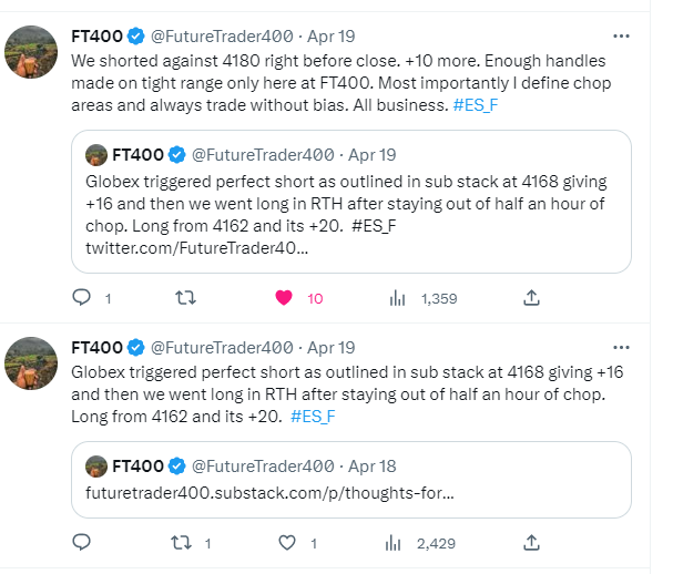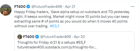 Hello traders, Last week /ES futures closed up only 30 points from its open. It traded up 4198 and down to 4135 a mere 55 point range. FT400 nightly setups for sub stack subscribers and live telegram setups provided 200+ points during the week. Visuals of some twitter post throughout the week.