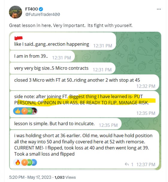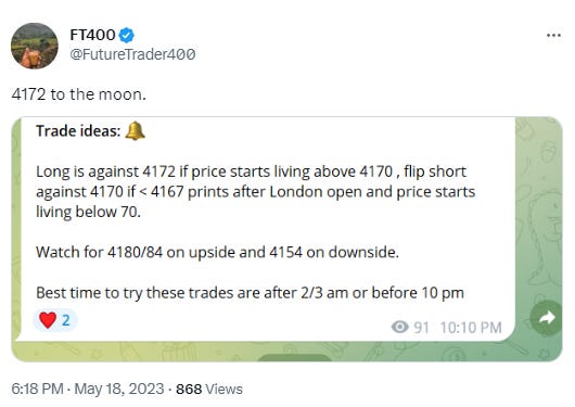 Hello traders, Hope you all had great relaxing weekend. We continue to say in balance. Last week /ES futures closed up good 68 points up from its open. It traded up 4227and down to 4120 a good 107 point range. FT400 nightly setups for sub stack subscribers and live telegram setups provided 300+ points through the week. Visuals of some twitter post throughout the week.