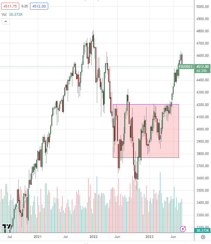We broke out of 400 point chop box during first week of June. At this point bulls are in control of the market until we go back inside the box, that is below 4200 again. There is likely chance we go there at some point but we don’t predict and just react so we will trade what we see. Main levels I am watching are, 4596, 4588, 4552🔥, 4538🔥, 4520,4502, 4586,4466/70. I will also be keeping eye as we may start trajectory back to lower edges of the chop box. Rest of the levels, live setups and other educational content as it happens are posted on private telegram