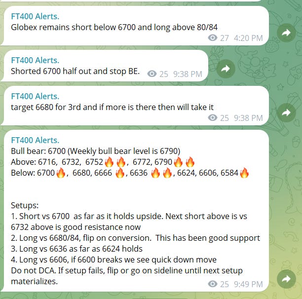 Plan with Setups and Levels that works. No bias or no prediction does not mean we do not have levels/setups and plan in place day before and given night before so you can use in Globex as well as in RTH. And most important thing is plan works like magic. You need to click buttons as outlined in plan for entry, scale out and liquidate. Also if a setup reverses or fails, wait for next setup, next opportunity.